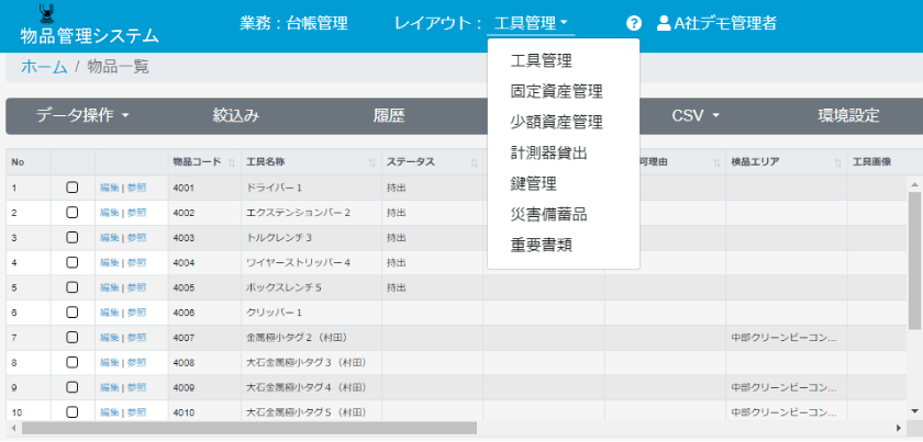 複数部門の複数の物品台帳から貸出台帳が作成できます。これによりPC、制服、鍵、メディア、工具など異なる種類のモノでも種類に合わせて管理項目が個別に設定できます。